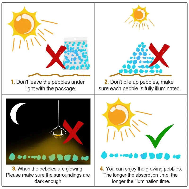 To make the most of their luminous glow, follow these simple tips: ensure each pebble is exposed to light individually, avoid stacking them, and place them in a dark environment for optimal illumination.